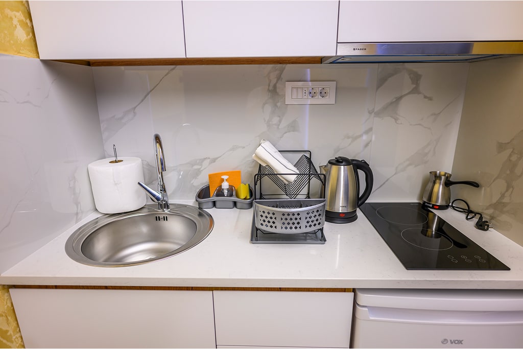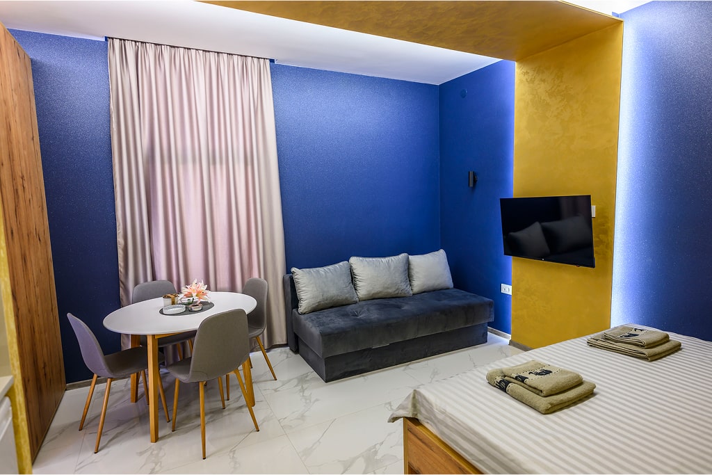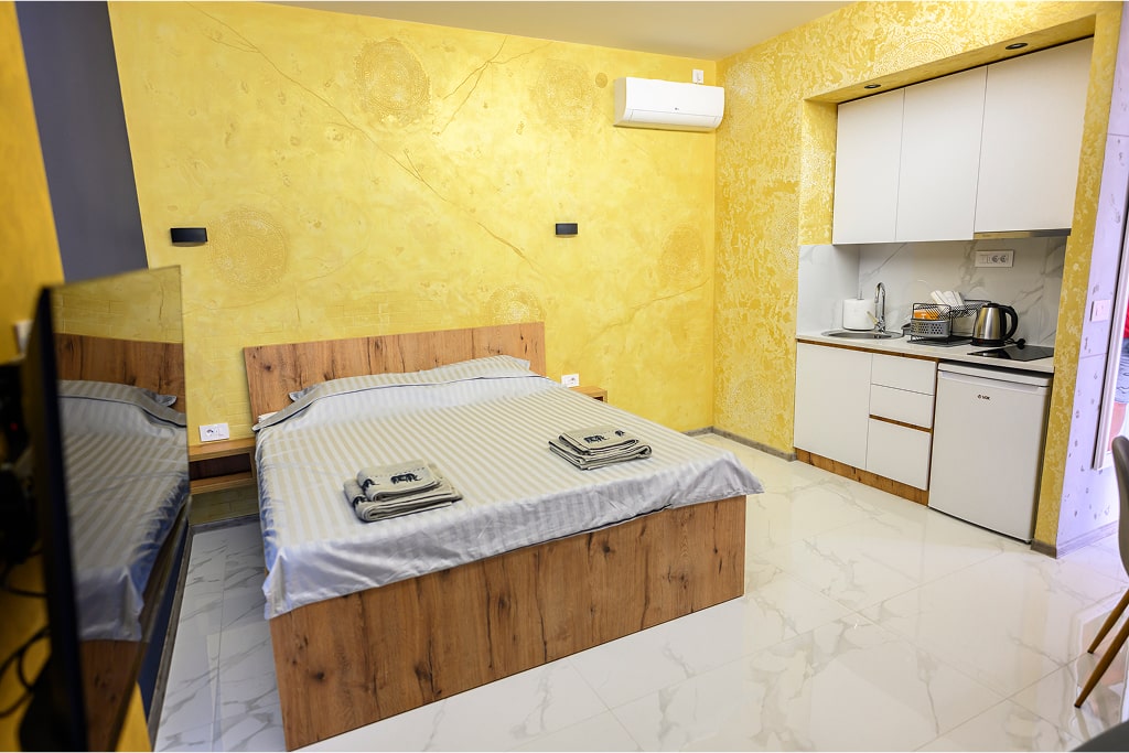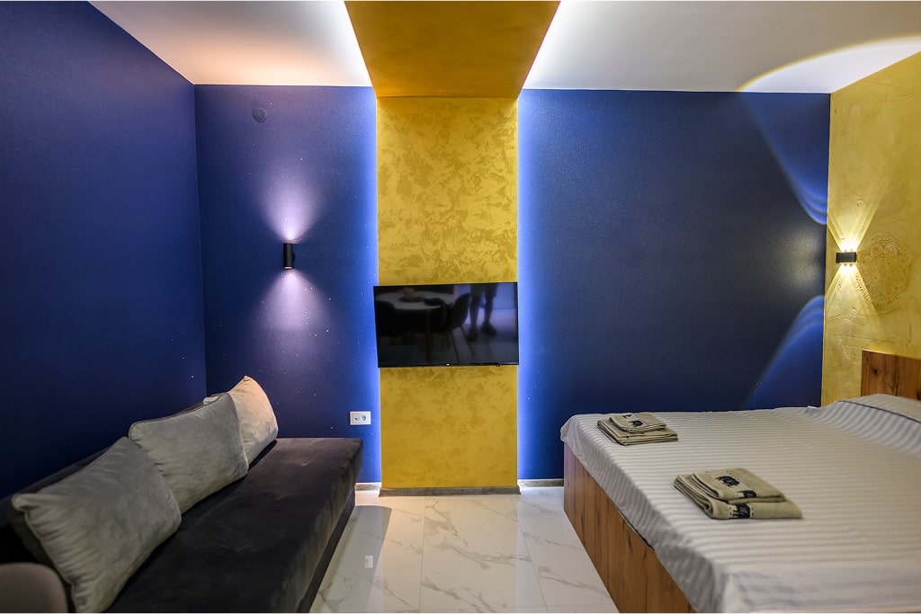 Topao ambijent i elegantna žuta tekstura zidova daju ovom apartmanu vedrinu i prijatan osećaj doma. Kombinacija sa modernim plavim akcentima i svetlim nameštajem stvara savršen balans između udobnosti i stila. Apartman je idealan za boravak dve osobe i opremljen je WiFi internetom, klimom i obezbeđenim parking mestom. Sve što vam je potrebno za miran i opušten boravak nalazi se upravo ovde.