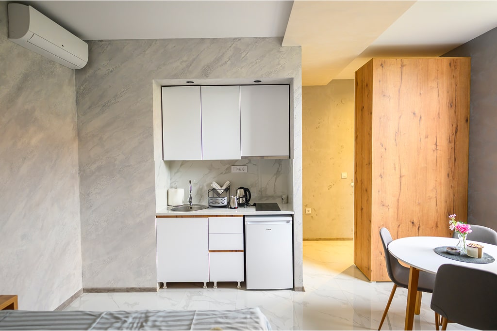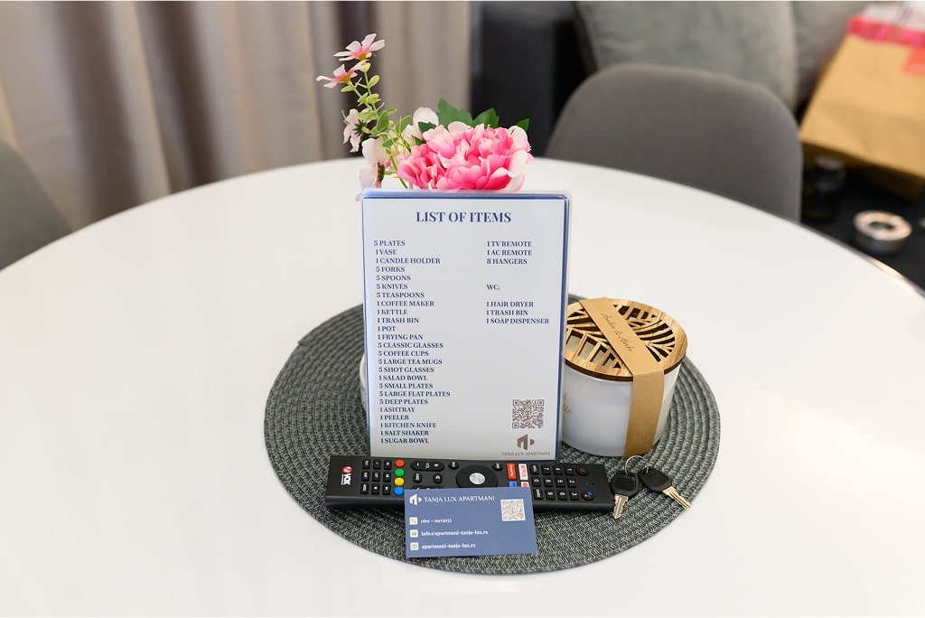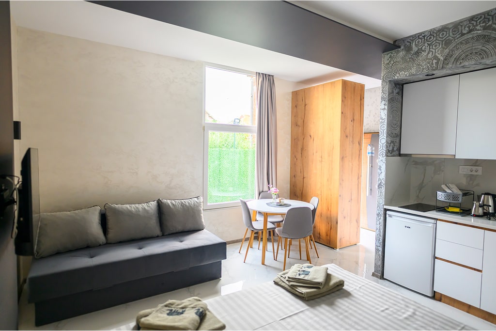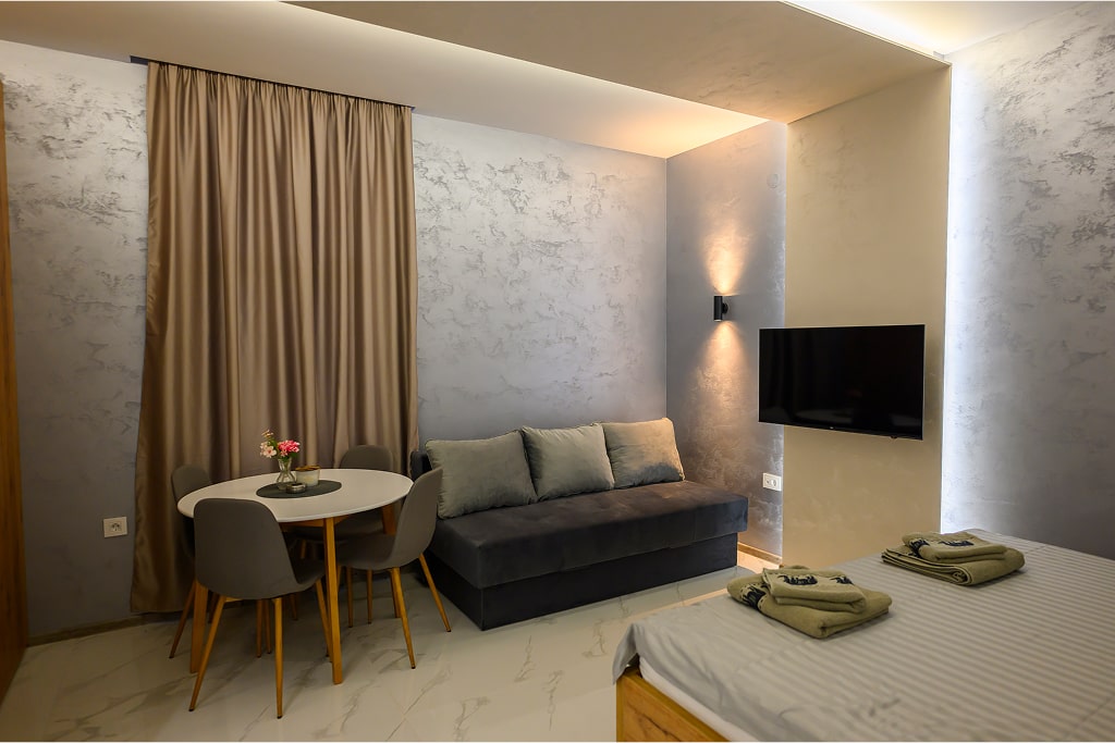 Apartman 7 odiše prozračnošću i jednostavnom elegancijom. Svetli zidovi sa nežnom sivom teksturom stvaraju savršen kontrast tamnim nameštajem i prirodnim drvetom, dajući prostoru smiren i savremen izgled. Idealno za sve koji vole minimalizam i uredan ambijent, uz sve pogodnosti kao što su WiFi, klima uređaj i privatni parking. Opuštanje i komfor na jednom mestu.